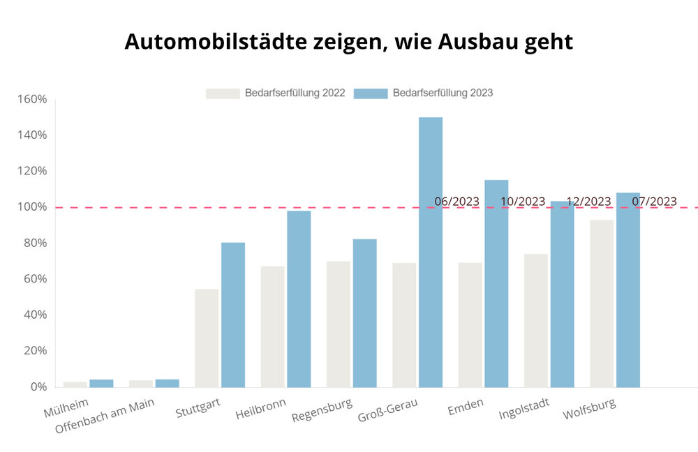 Wolfsburg deckt bereits 93,2% des Bedarfs von 2030 ab und wird im Juli 2023 die 100%-Marke erreichen (Hinweis: In aktuellen Daten von 2023 wurden rückwirkend ca. 300 frei zugängliche Ladestationen entfernt. Damit wird sich die angegebene Prognose ändern). Emden lag Ende 2022 bei 69,4%, ist im Ausbau aber besonders aktiv und wird nach unserer Prognose bereits im Oktober das Ziel für 2030 erreichen. Groß-Gerau macht einen besonders großen Sprung und sollte bereits im Juni am Ziel sein.