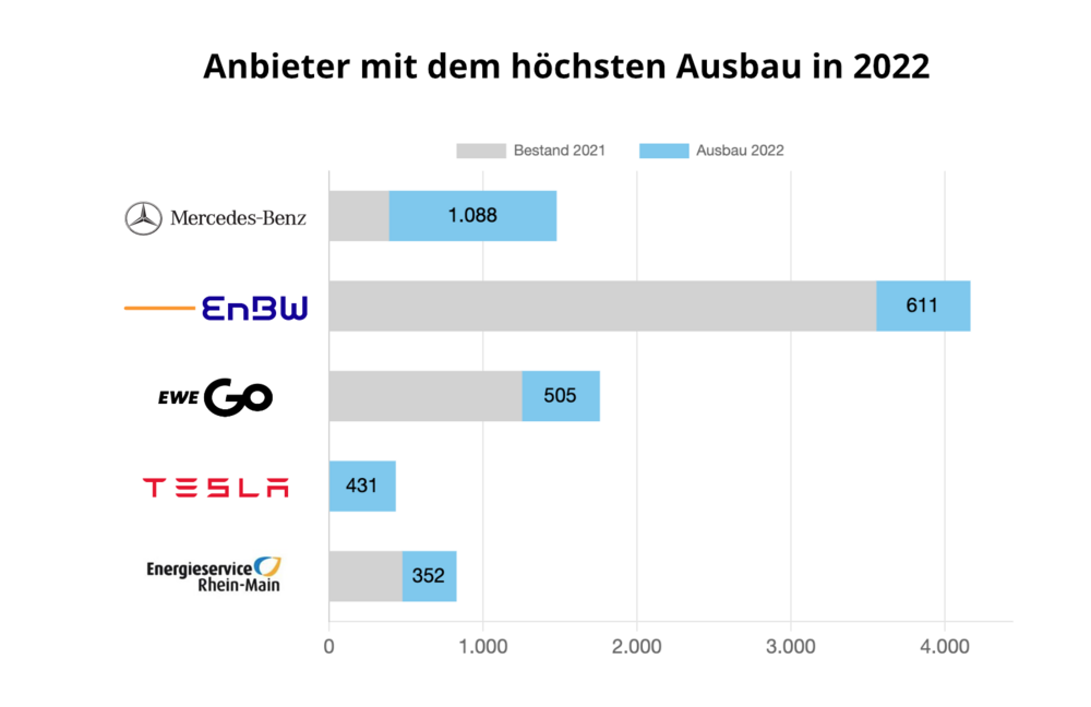 Interessant ist auch, wie stark sich die einzelnen Anbieter beim Ausbau im letzten Jahr engagiert haben. Mercedes-Benz hat seinen 1. Platz der Tatsache zu verdanken, dass sie in einem Jahr die Anzahl der Ladepunkte fast verdreifachen konnten. Die Inbetriebnahme von 1.088 neuen Ladepunkten ist eine beeindruckende Leistung. Es folgen die Betreiber EnBW mobility+ und EWE Go. Auf dem 4. Platz steht Tesla, die mit der Öffnung von 431 Schnellladepunkten für andere Automarken jetzt ebenfalls in der Statistik vertreten sind – mit weiterem Zuwachs in den kommenden Jahren ist zu rechnen.