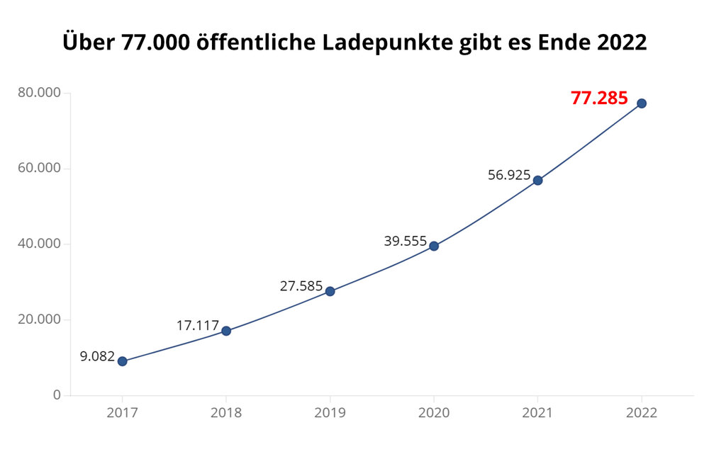 Die Anzahl der öffentlichen Ladepunkte betrug zum Jahresende 2022 exakt 77.285. Damit können also mehr als 77.000 E-Autos in ganz Deutschland gleichzeitig an der öffentlichen Infrastruktur geladen werden. Dies ist eine deutliche Steigerung gegenüber den Vorjahren. So waren es vor 5 Jahren noch 9.082 Ladepunkte und ganz zu Beginn des Ausbaus vor 10 Jahren sogar nur 1.052 Ladepunkte.