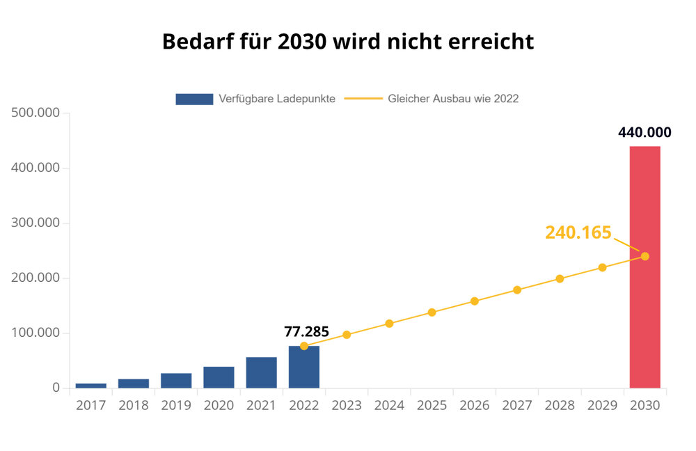 Wenn wir davon ausgehen, dass mit dem gleichen Wachstum wie im Jahr 2022 weiter ausgebaut wird, also dass jedes Jahr 20.360 neue Ladepunkte hinzukommen, so wird es Ende 2030 genau 240.165 Ladepunkte geben (gelbe Kurve). Das ist etwas mehr als die Hälfte des gesteckten Zieles.
